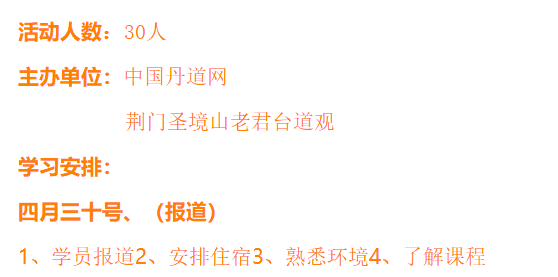 有中国丹道网和湖北荆门老君台道观,联合举办的中国丹道网春季线下初级研修班圆满结束,活动期间,来自全国各地三十余名丹道修炼爱好者光临荆门老君台,在五天学习交流中,气氛和谐,认真听课,练功认真。 课程期间,许天阳道长不辞辛劳的为大家讲解道家内丹入门知识,具体内容及活动花絮如下: